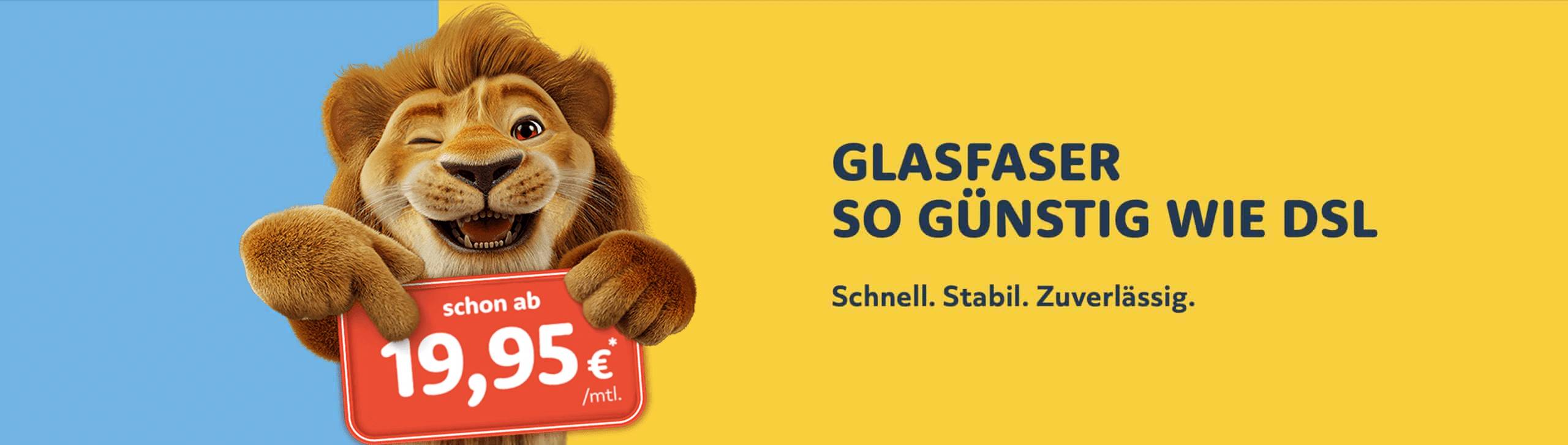 *Das Angebot gilt bis zum 31.03.2026 und nur für Neukunden. In den ersten 6 Monaten beträgt die monatliche Grundgebühr 24,95 €, danach gilt die reguläre Grundgebühr gemäß Tarifübersicht. Zzgl. einmaligem Anschlusspreis für die Tariffreischaltung von 69,95 €. Auf unsere Mietrouter (optional) gewähren wir Ihnen im Rahmen der Aktion für 6 Monate je 4,95 € Rabatt, danach gilt der reguläre Mietpreis. Mindestvertragslaufzeit: 24 Monate. Alle Preise beinhalten 19 % USt. Prüfung der Verfügbarkeit des Angebots im Verfügbarkeitscheck. Weitere Informationen, Leistungsbeschreibungen, Produktinformationsblätter und eine detaillierte Preisliste in den Downloads.